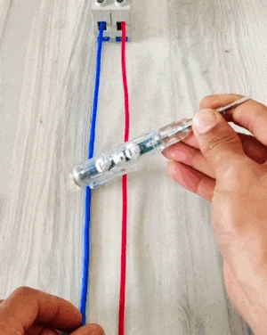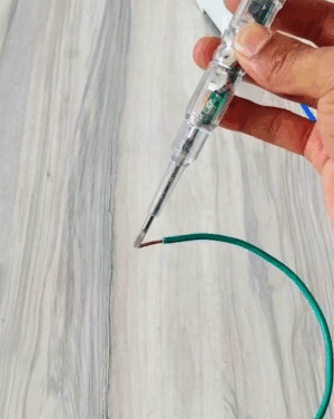 Для проверки напряжения в сети необходимо взять индикаторную отвертку и коснуться щупом (верхним или нижним) проводника. Если она касается нулевой проволоки, на ручке горит зеленый свет, если провод под напряжением — красный и зеленый свет одновременно, а при разрыве индикатор не будет светиться.