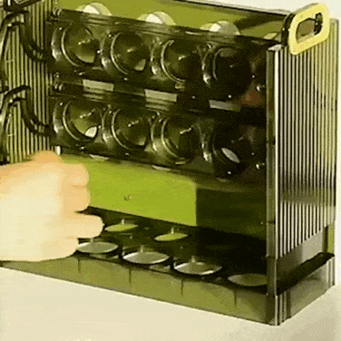 Конструкция не содержит дверцы, поэтому это позволяет удобно складывать или брать яйца с любой полки, без разбирания органайзера.