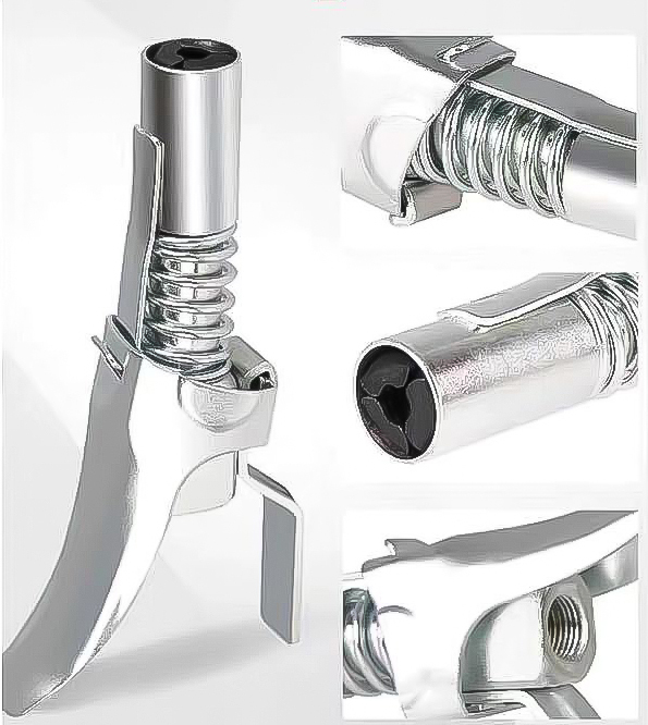 Соединительная муфта соединяет горловину пистолета с элементами, которые необходимо смазать. Она работает под высоким давлением до 12 000 PSI и с любой жидкостью. Вход муфты подстраивается: нажмите рычаг, чтобы расслабить ее, установите на элемент и зажмите