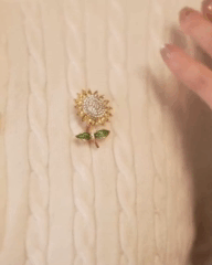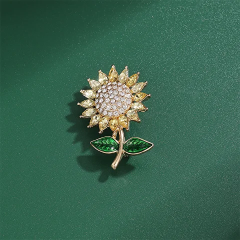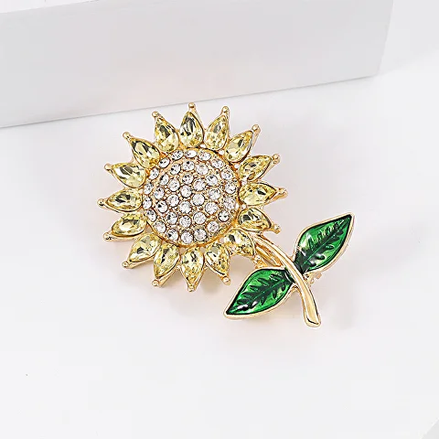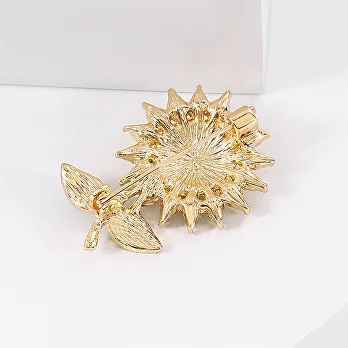 Брошь выполнена в форме подсолнечника. Каждый лепесток украшен яркими желтыми стразами, придающими аксессуару особого шарма и блеска.