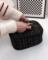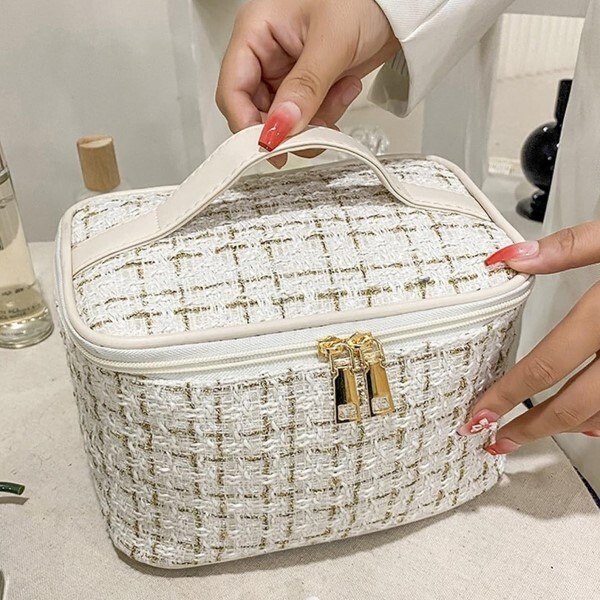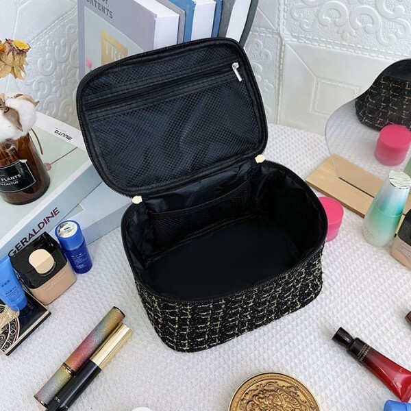 Эта косметичка поражает своим стильным дизайном. Она изготовлена из твидовой ткани, которая отличается уникальным плетением нитей, поэтому имеет приятную на ощупь текстуру и оригинальный вид