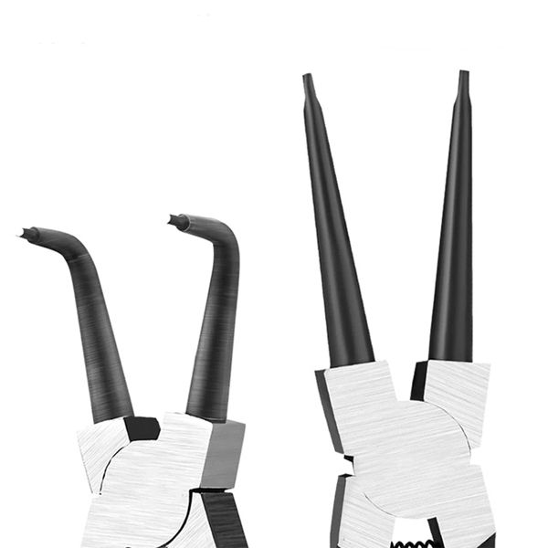 В комплекте есть 2 пары щипцов для внутренних и внешних колец с прямыми и изогнутыми под углом 90° губками. Прямые вставляются в отверстия внутренних колец и сжимают их или разжимают внешние, чтобы одеть на вал или снять с него. Изогнутые выполняют те же функции, но более удобны для работы в труднодоступных местах