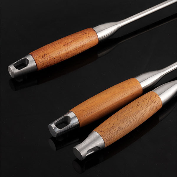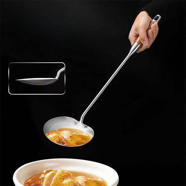 Эргономичная деревянная рукоятка обеспечивает комфортный хват даже влажными руками. Отверстие в верхней части позволяет подвесить лопатку на кухонный крючок для быстрого доступа