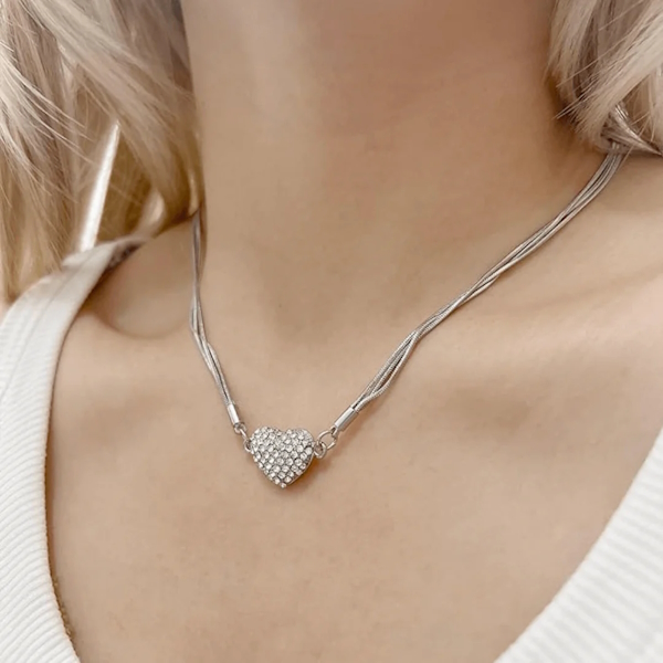 Кулон в форме сердца со сверкающими стразами сразу привлекает к себе внимание, а многослойная цепочка добавляет украшению оригинальности