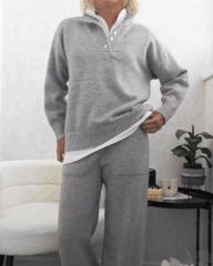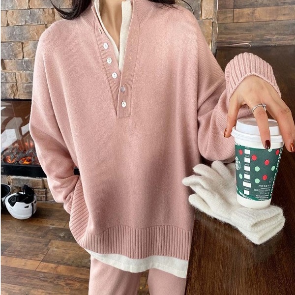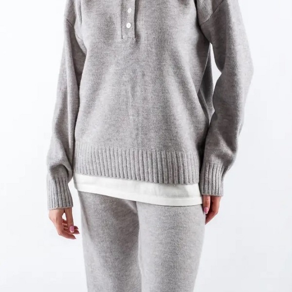 Кнопки в верхней части свитера позволяют расширить горловину и надеть вещь максимально удобно. Широкий пояс-резинка на брюках хорошо растягивается и комфортно прилегает к телу