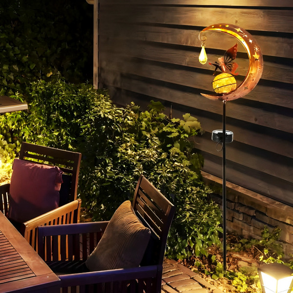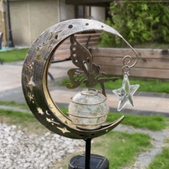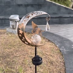 Стеклянный шар излучает приятный теплый свет, который проходит через многочисленные отверстия на металлическом полумесяце. Это идеальный элемент декора для вечерних посиделок на свежем воздухе или для романтических вечеров