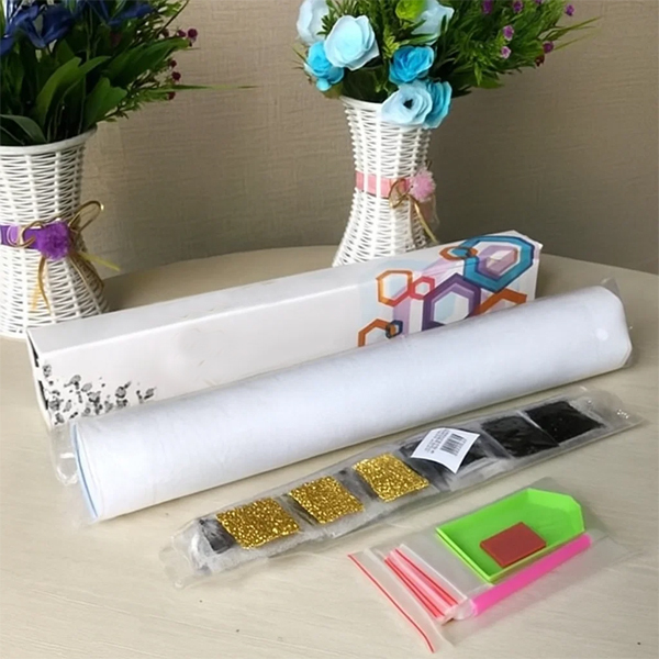 Узоры выкладываются стразами разных форм и размеров. Они красиво сверкают в лучах света, а золотистые акценты удачно контрастируют с глубокими темными оттенками. Благодаря этому готовая картина выглядит чрезвычайно эффектно. Создавать узоры будет легко, ведь на полотно нанесена четкая разметка