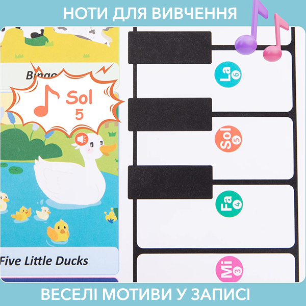 Книга содержит интерактивное пианино, которое точно воспроизводит ноты, а также проигрывает веселые мотивы. Это делает обучение еще интереснее и полезнее, ведь ребенок одновременно развивает память, слух и логику