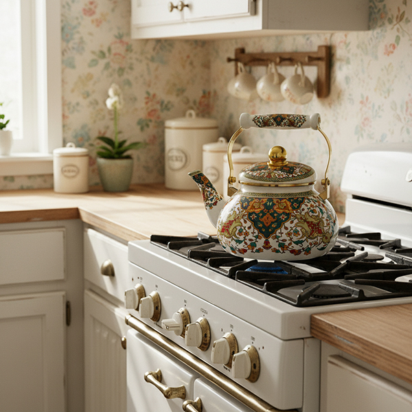 Изысканный узор в винтажном стиле добавляет уюта кухне и создает атмосферу традиционного чаепития. Чайник прекрасно подойдет к интерьеру в светлых тонах