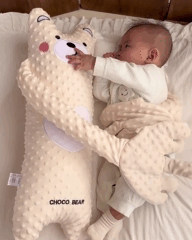 Подушка-игрушка в виде мишки имитирует мягкие объятия мамы. Длинные руки заботливо окутывают ребенка по бокам и поддерживают головку. Младенец чувствует себя так, как будто его держат на руках, поэтому быстрее успокаивается и засыпает. Мягкая фиксация уменьшает взмахи ручками (рефлекс Моро), благодаря чему малыш реже просыпается