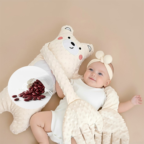 Внутри подушки находится мягкий мешочек с красной фасолью, который при необходимости можно вытащить и нагреть. Тепло не только успокаивает младенца, но и расслабляет мышцы и уменьшает колики. В отличие от грелок с водой, фасоль равномерно распределяет тепло и дольше остывает