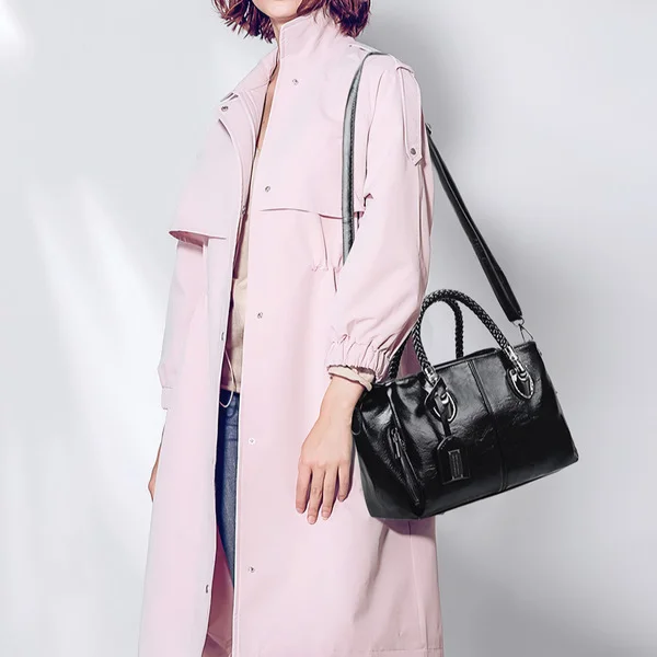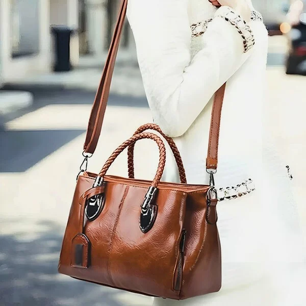 Аксесуар оснащений тонкою шкіряною ручкою з виразною плетеною фактурою, яка додає їй унікального вигляду. Крім того, він має додатковий регульований ремінець, який можна прикріпити до карабінів і носити сумку на одному плечі або через плече