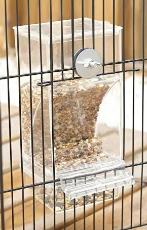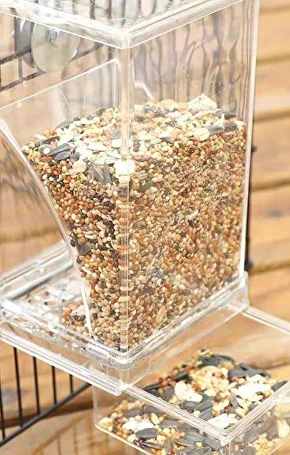 В нижній частині годівниці є шухляда для рештків корму, завдяки якій у клітці завжди буде чисто. Адже під час поїдання, зерна падають відразу в контейнер, а не розсипаються довкола