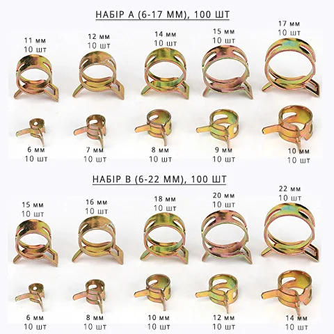 Кожен набір складається зі 100 хомутів діаметром від 6 до 17 мм (набір А) та від 6 до 22 мм (набір В). У комплектах всі наявні розміри представлені однотипними виробами по 10 штук