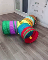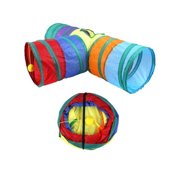 Тунель неодмінно сподобається котику, адже виконаний у яскравих кольорах, до того ж має 3 основні отвори і додатковий отвір зверху, а також помпон на мотузці. Всередину можна покласти іграшку, щоб тваринці було ще цікавіше проводити час у схованці