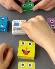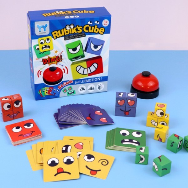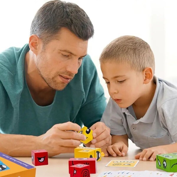 Веселі зображення на картках прекрасно підіймають настрій, роблячи гру неймовірно захопливою. Складайте різні емоції з кубиків і намагайтеся відтворити їх на своєму обличчі — це додасть ще більше радощів і сміху під час гри