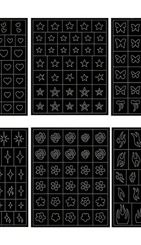 У набір входять 6 аркушів з трафаретами у формі сердечок, зірочок, квітів, полум'я тощо. Обирайте дизайни, що відповідають вашому настрою, або експериментуйте та комбінуйте одразу кілька, створюючи оригінальні візерунки