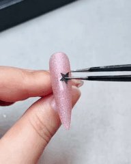 Приклейте трафарет на поверхню нігтя після нанесення базового покриття та лаку. За допомогою губки нанесіть пудру для манікюру, після чого зніміть наліпку та покрийте ніготь топ-гелем або фіксатором, щоб довше зберегти візерунок