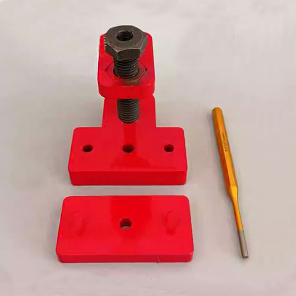 Щоб роз'єднати ланцюг, розмістіть його на підставці інструмента, таким чином, щоб потрібний валик збігся з отворами гвинта та основи. Міцно закрутивши гвинт, вставте пробійник у його отвір та вдарте молотком, щоб вибити валик