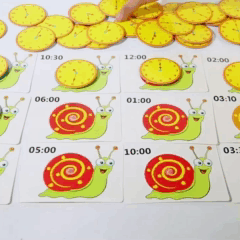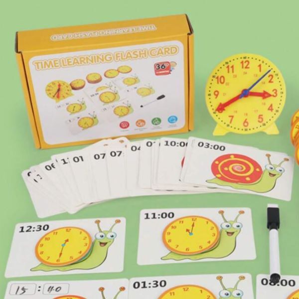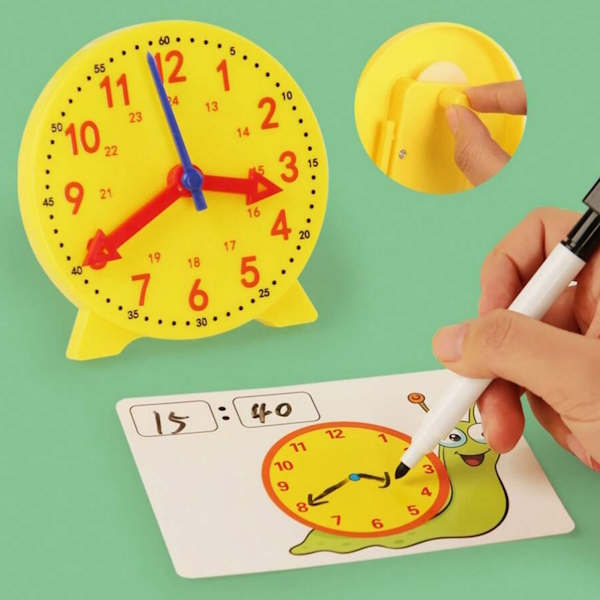 Рухаючи стрілки годинника, дитина має показати час, зображений цифрами на картках. І навпаки: час на циферблаті треба вписати на картки. А оскільки маркер стирається, завдання можна виконувати знову і знову