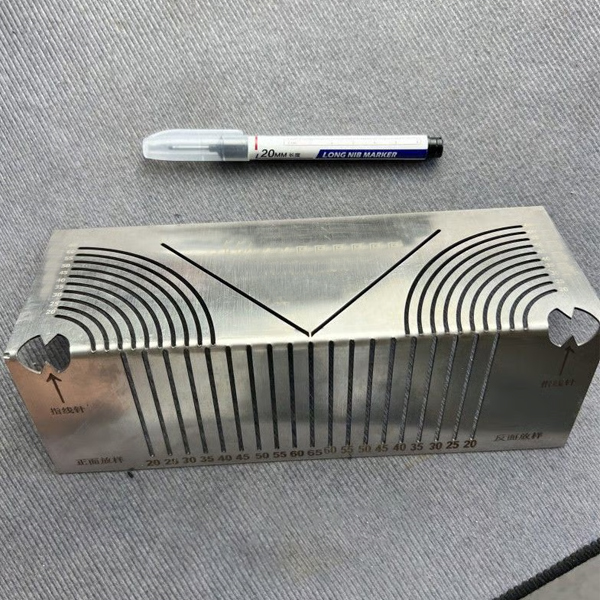 Шаблон зігнутий під кутом 90°, що дуже зручно для роботи з прямокутним профілем та профільними трубами. На відміну від звичайної лінійки, він не ковзатиме по поверхні під час роботи, що гарантує точність розмітки