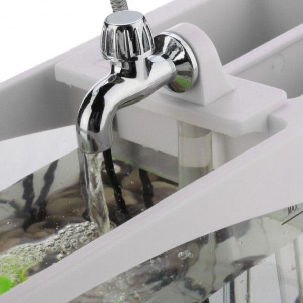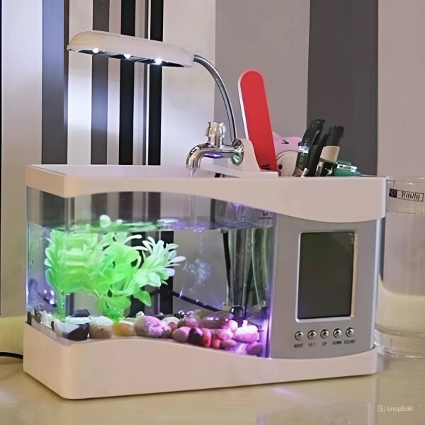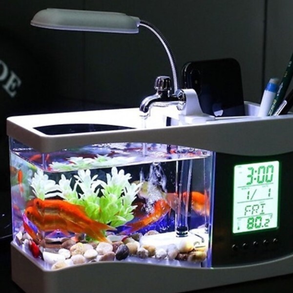 Маленький акваріум з підсвічуванням і органайзером, має дисплей і відображає годинник, будильник, календар та інше
