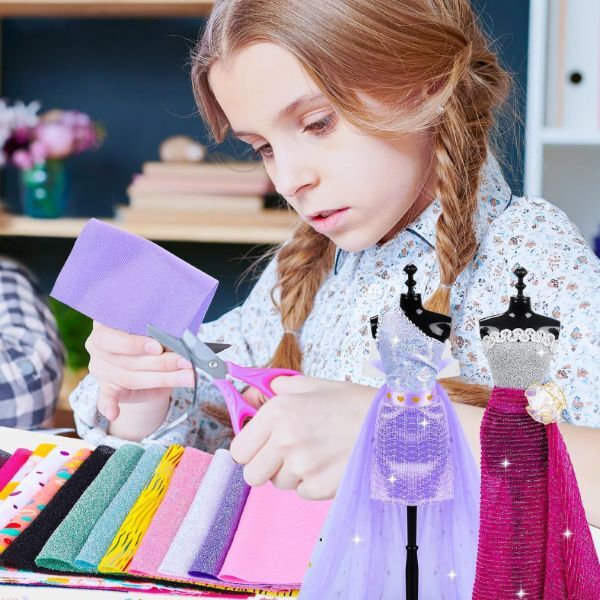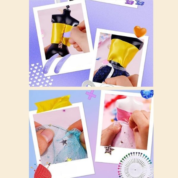 Набір дозволяє обрати спосіб створення суконь: дівчатка від 8 років можуть користуватись голкою і ниткою, а для молодших дітей передбачений більш простий і безпечний метод