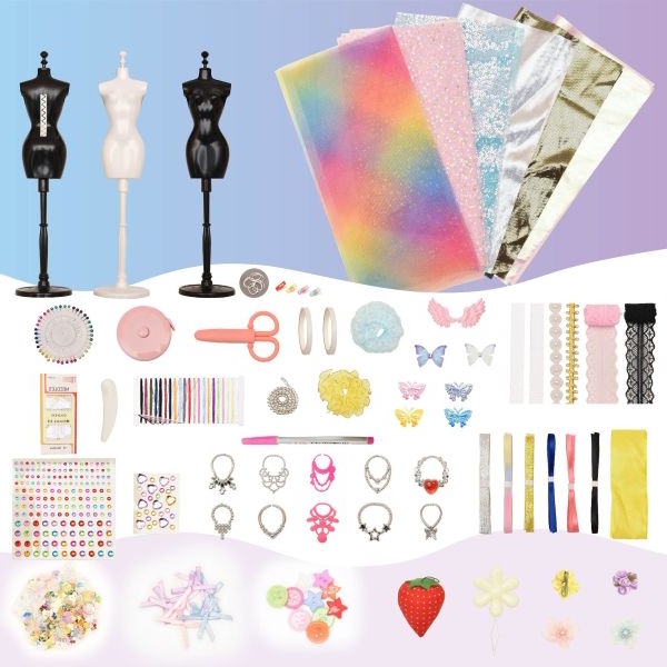 Комплект містить 3 мініатюрних манекени, 6 видів тканини, стрічки і мереживо, ножиці, нитки, декоративні аксесуари тощо. В наборі 460 різних предметів — все, що потрібно для створення чарівних суконь