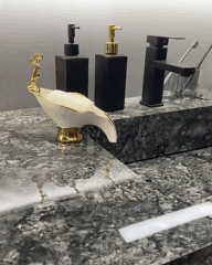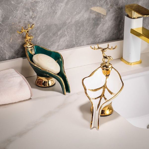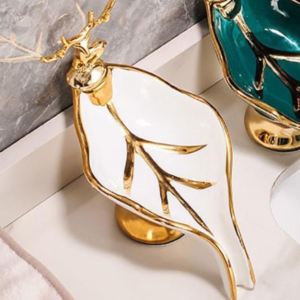 Мильниця у ванну у формі листочка і прикрашена мініатюрною статуеткою оленя і золотистим кантом