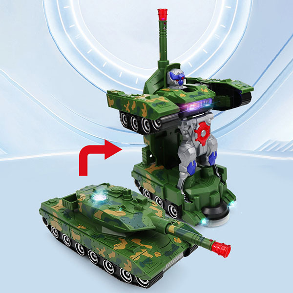 Іграшка перетворюється з танка на робота одним натисканням на кнопку, розташованій на корпусі. Це миттєвий і цікавий процес, що додає інтриги та розширює можливості гри