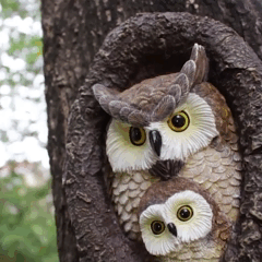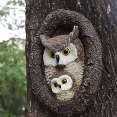 Декор для саду повторює фактуру кори й оперення, імітуючи сови, що визирають із дупла сов