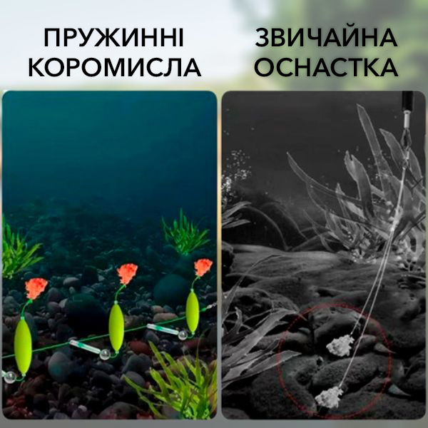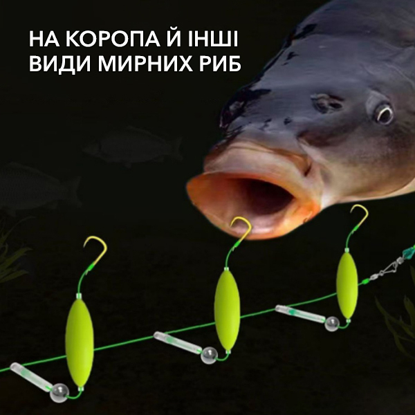 Яскраві поплавці не лише додатково привертають увагу риб, а й забезпечують вертикальне положення гачків на дні водойми. Як наживку, можна використовувати живця, бойл, пелетс або кукурудзу