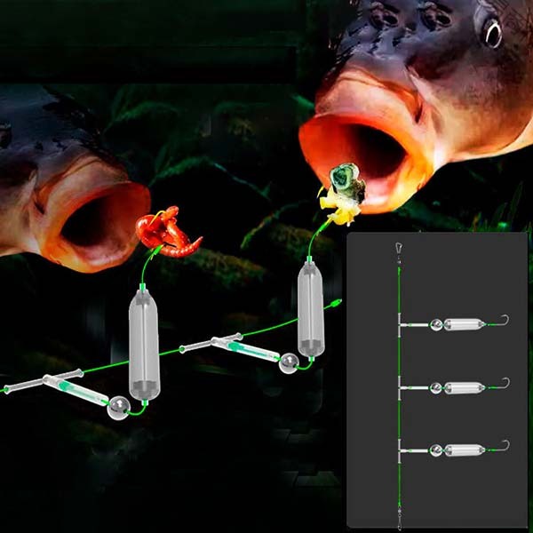 На кожному повідцю нав’язані гострі гачки розміром 12.5 х 6.1 мм, що ідеально підходять для фіксації силіконових приманок, а також рухомих живців на кшталт малька чи дощових черв’яків