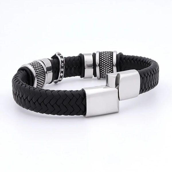 Металеві вставки зі структурованою поверхнею додають об’єм і глибину. Контраст текстур створює візуальну динаміку — браслет виглядає дорого й брутально