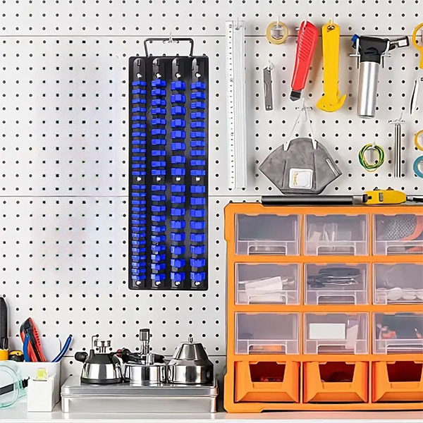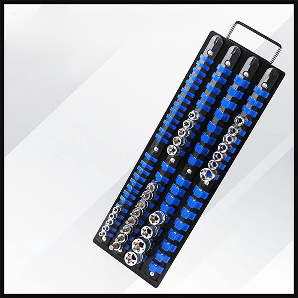Органайзер має 4 напрямні з окремими кріпленнями, що вміщують до 80 торцевих головок. Кожна секція призначена для головок одного типу — 1/4", 3/8" або 1/2", що спрощує сортування та доступ до потрібного аксесуара