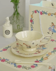 Кожен елемент набору прикрашено чарівними ілюстраціями у стилі відомої казки: Аліса, кролик, квіти, зірки та метелики оживають на теплих молочно-кремових тонах. Ідеальний подарунок для фанатів історії або для створення особливої атмосфери вдома