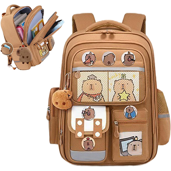 З цим рюкзаком ваша дитина із задоволенням ходитиме до школи. Він має стильний дизайн, приємний карамельний колір і комплектується аксесуарами з кумедними капібарами — героями популярних мемів. У набір входять брелок, з яким цікаво гратися на перервах, 3 картки та 6 значків, які можна комбінувати на свій смак. Зверніть увагу — аксесуари можуть відрізнятися від зображених на фото