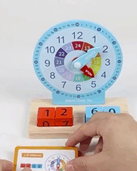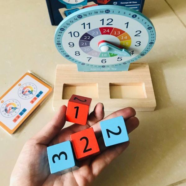 Окрім аналогового циферблата зі стрілками, комплект містить 4 кубики з цифрами, які допоможуть познайомити дитину з 24-годинним форматом часу