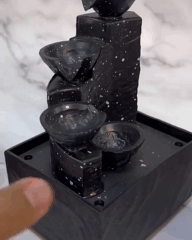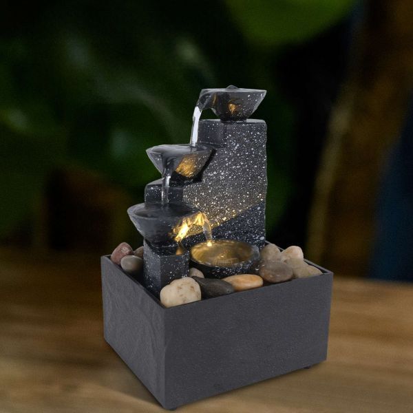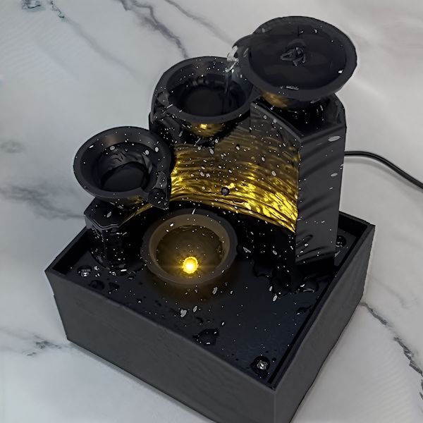 Потік води спускається по чотирьох чашах, розташованих на різних рівнях, створюючи мелодійне дзюрчання. Такий приємний акустичний ефект допомагає розслабитися та зняти стрес після напруженого дня