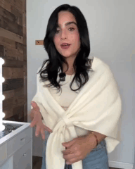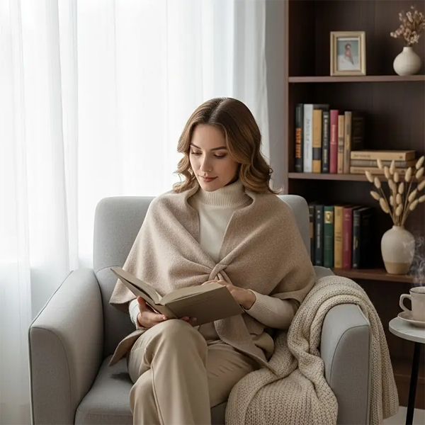У легку та м'яку накидку так приємно загорнутися в холоди. Вона виготовлена з поліефірного волокна з додаванням овечої вовни, тому красиво лягає на плечі та дарує відчуття затишку. Якщо стане тепло, ви можете зняти та скласти накидку — вона легко поміститься в сумку