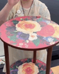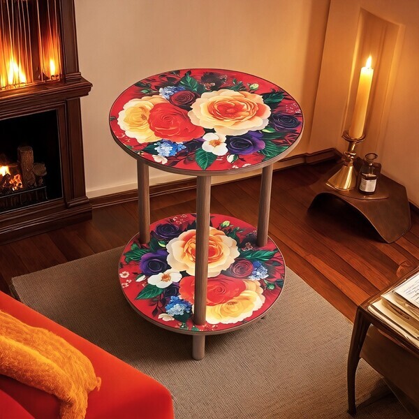 Стіл журнальний діаметром 40 см, висотою 52 см, прикрашений яскравим квітковим принтом