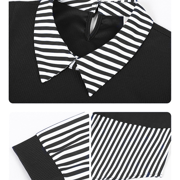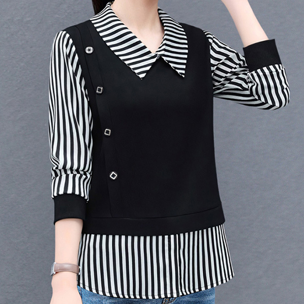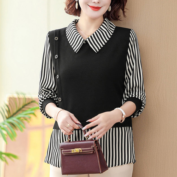 Стриманий, проте модний дизайн робить блузу універсальною — її можна носити як на роботу, так і на прогулянку. Вертикальні смужки візуально видовжують силует, роблячи фігуру стрункішою, а контрастна чорна вставка підкреслює талію. Завдяки легкій тканині блуза не обмежує рухів, гарантуючи комфорт протягом дня