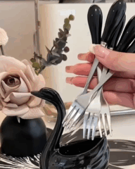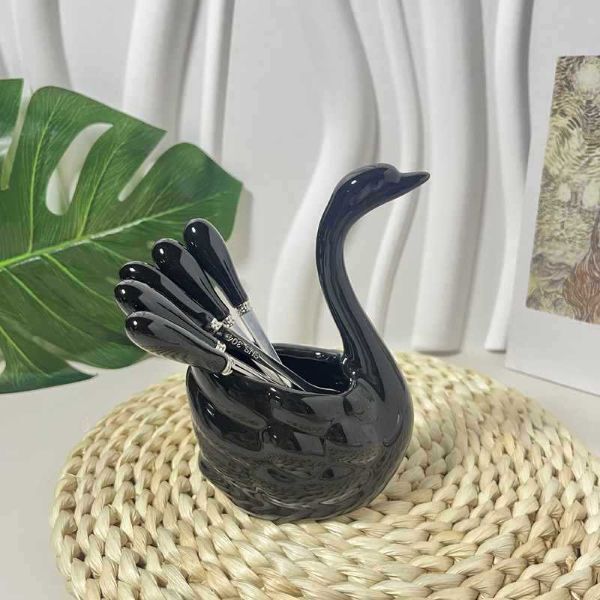 Підставка для столових приборів і шість виделок у комплекті, у формі лебедя в чорному кольорі