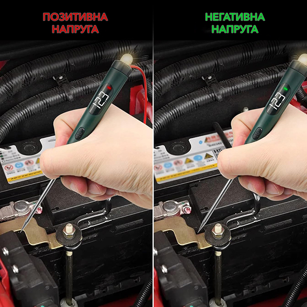 LCD-дисплей відображає точне значення напруги, а світлова індикація миттєво показує позитивний чи негативний полюс. Вбудована підсвітка робить прилад зручним для роботи у темряві