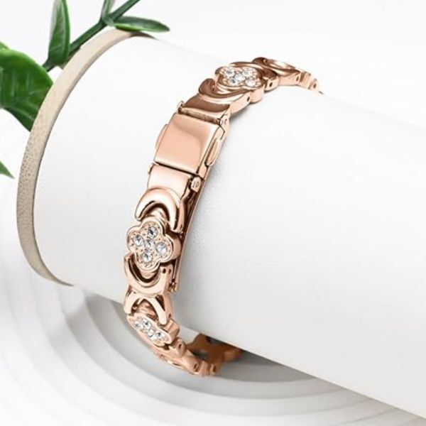 Лаконічний дизайн, рожево-золотистий колір і оздоблення стразами робить браслет неймовірно елегантним. Елементи у формі конюшини символізують удачу, любов і надію, тож прикраса стане талісманом для своєї власниці