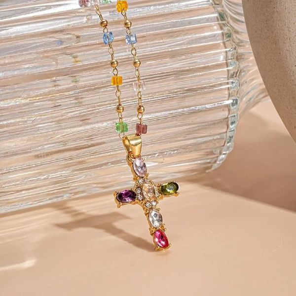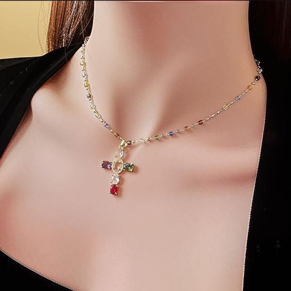 Ланцюжок з хрестиком жіночій, оздоблений блискучими кольоровими фіанітами