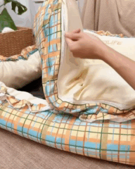 Ліжко виконане у модному картатому принті з приємним поєднанням кольорів, що додає кімнаті тепла та затишку. Чарівні рюші по периметру створюють ефект «диванчика» та додають виробу особливої ніжності та елегантності