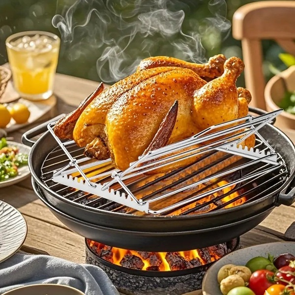 Завдяки регульованому куту нахилу ви зможете легко підлаштувати решітку під розмір курки, риби чи іншої страви. Така конструкція забезпечує стійке положення продуктів під час приготування, запобігає їх спаданню та дає змогу жиру природно стікати