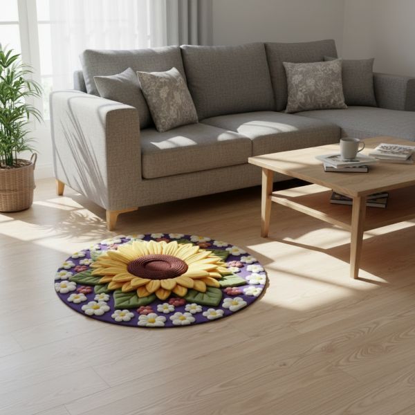 Яскравий 3D-дизайн із зображенням великого соняшника робить килимок надзвичайно стильним. Такий предмет інтер'єру додасть барвистих ноток і затишку вашій оселі