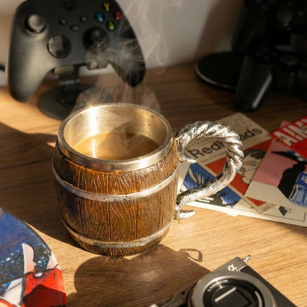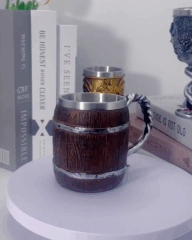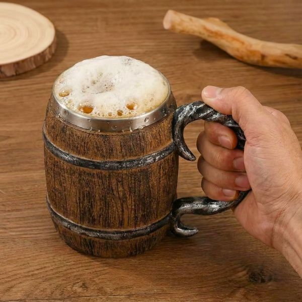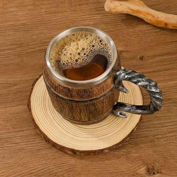 Кухоль виконаний у формі старовинної дерев’яної бочки з рельєфною текстурою та декоративними металевими елементами. Такий дизайн стає яскравим акцентом під час подачі напоїв